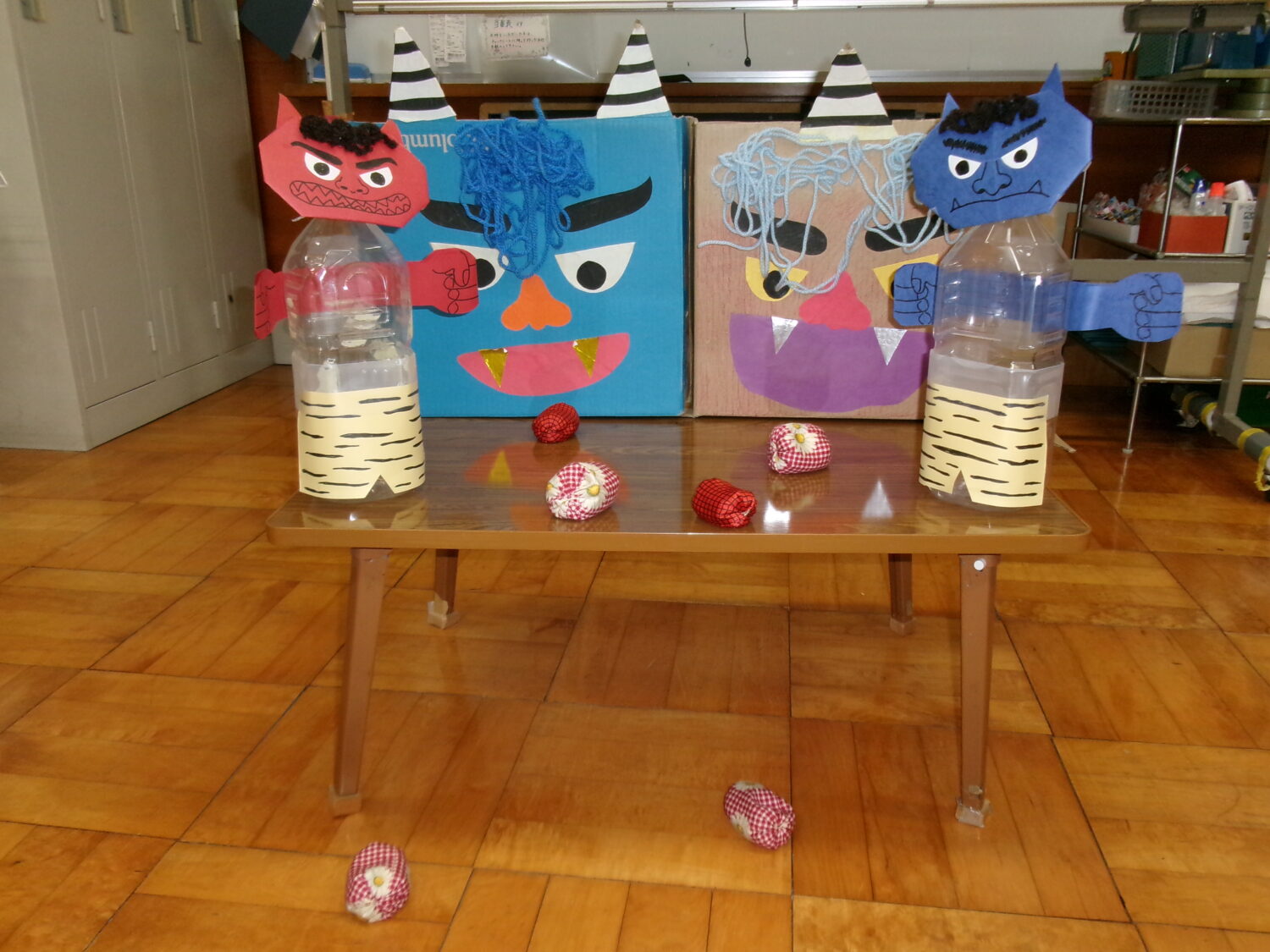 今年は段ボールで作った赤鬼と青鬼の前に、